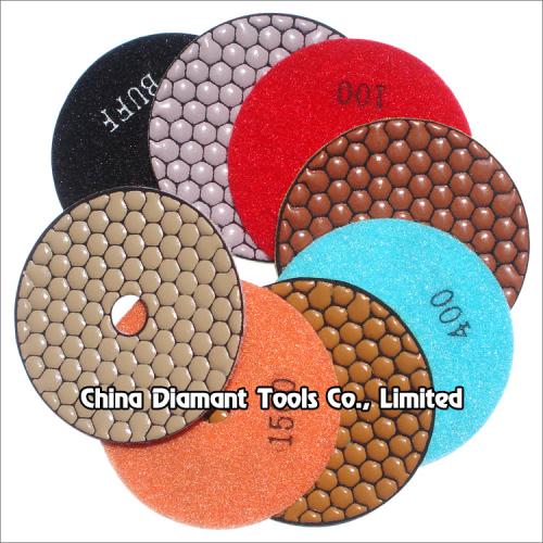 This honeycomb shape diamond polishing pads 8pcs set for dry polishing of stone contoured and straight edges(without using water as a coolant, or with little water), it is made up of high quality diamond powder and resin binder materials, and designed through scientific formula and advanced process technology, with good flexibility.